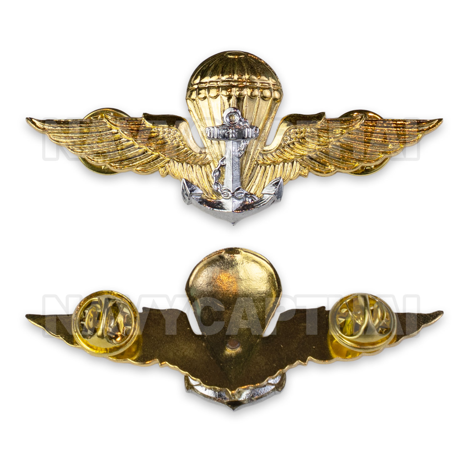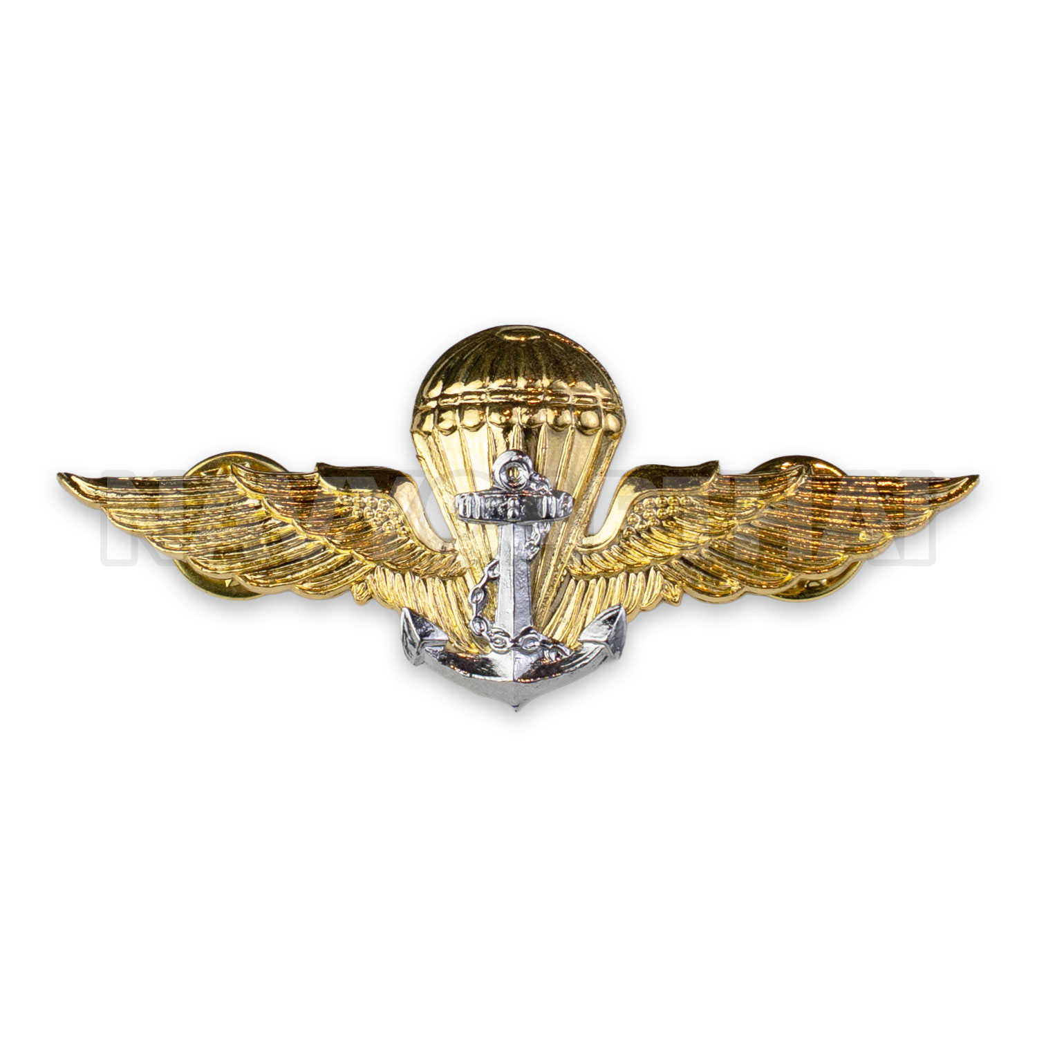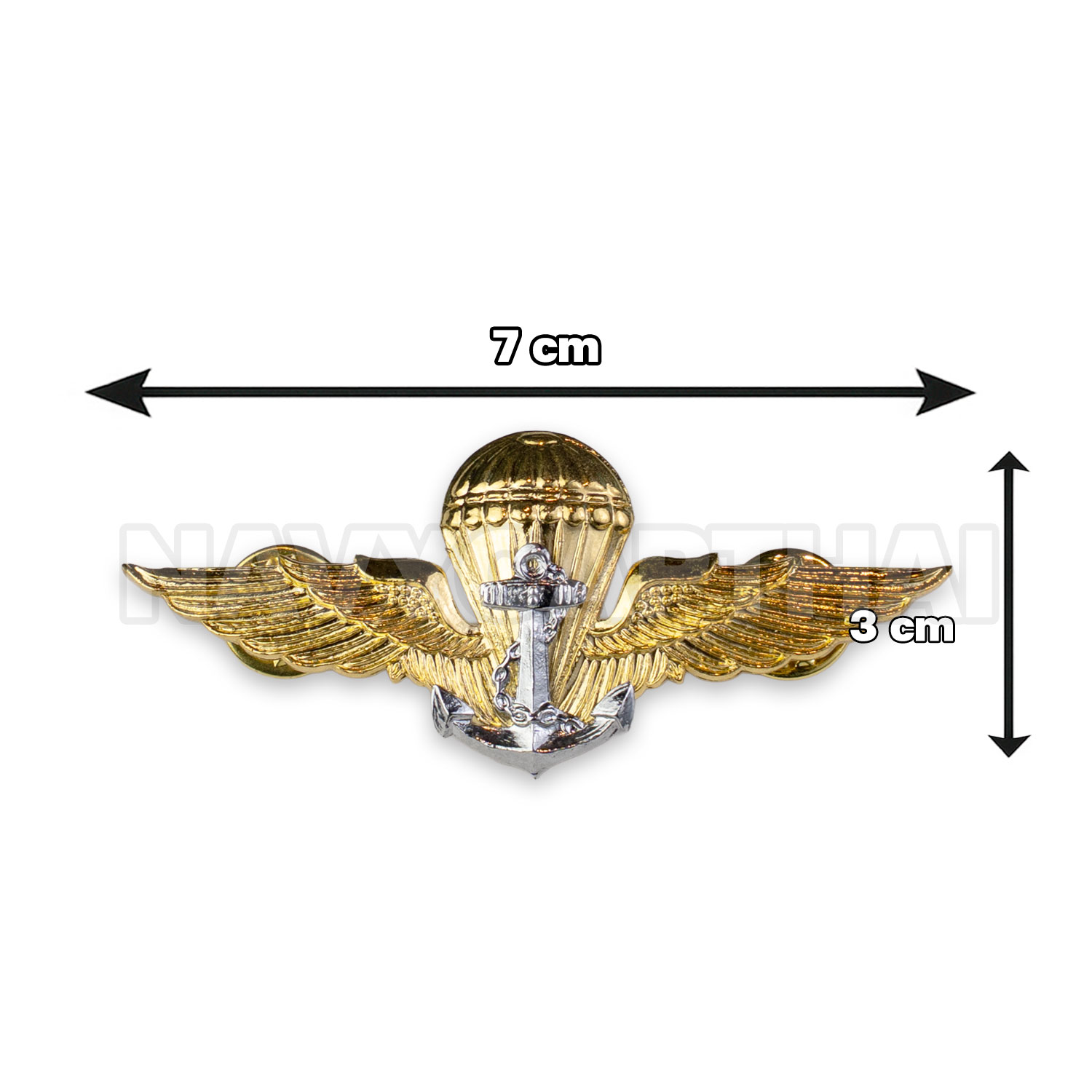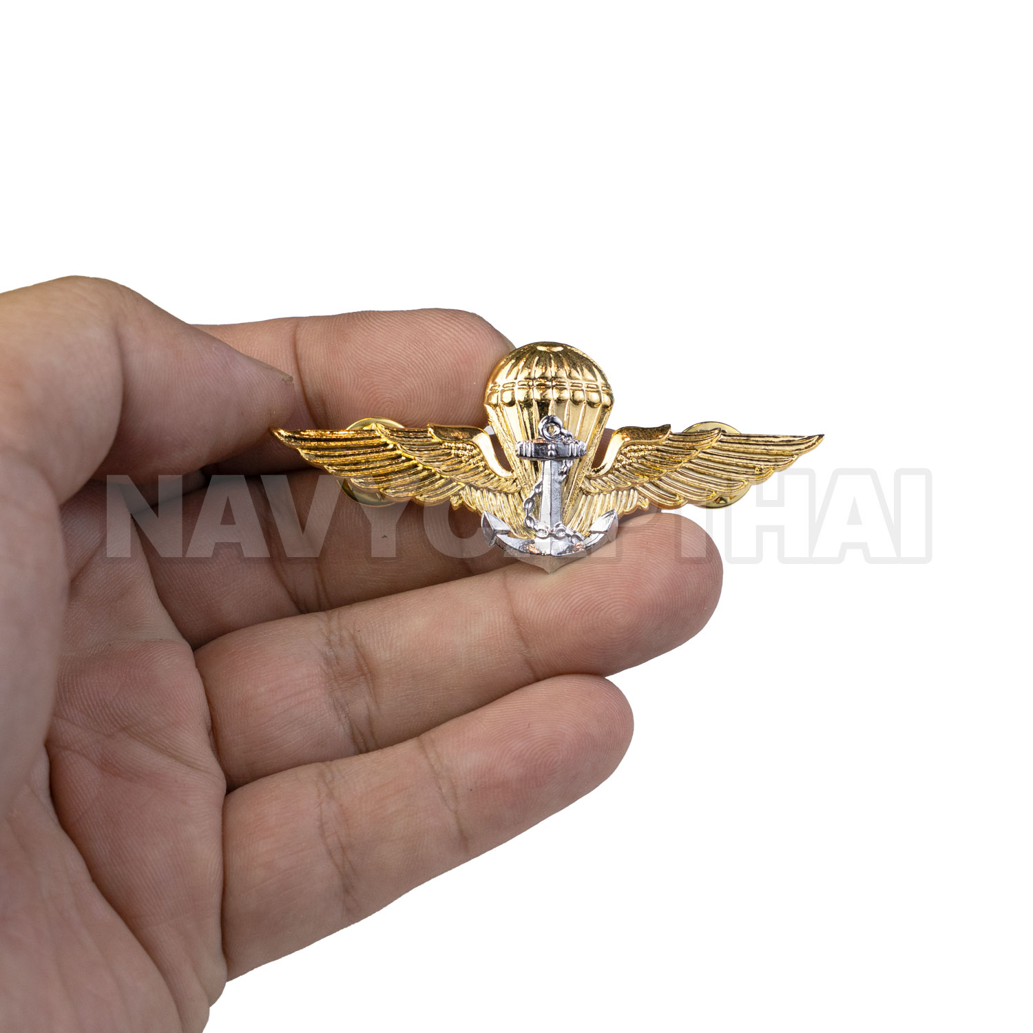 ปีกกระโดดร่มทหารเรือ (ปีกร่ม ทร.) งานโลหะชุบสีทอง ตัดลายคมชัด พร้อมสัญลักษณ์สมอเรือด้านหน้า เหมาะสำหรับติดเครื่องแบบ หรือสะสม