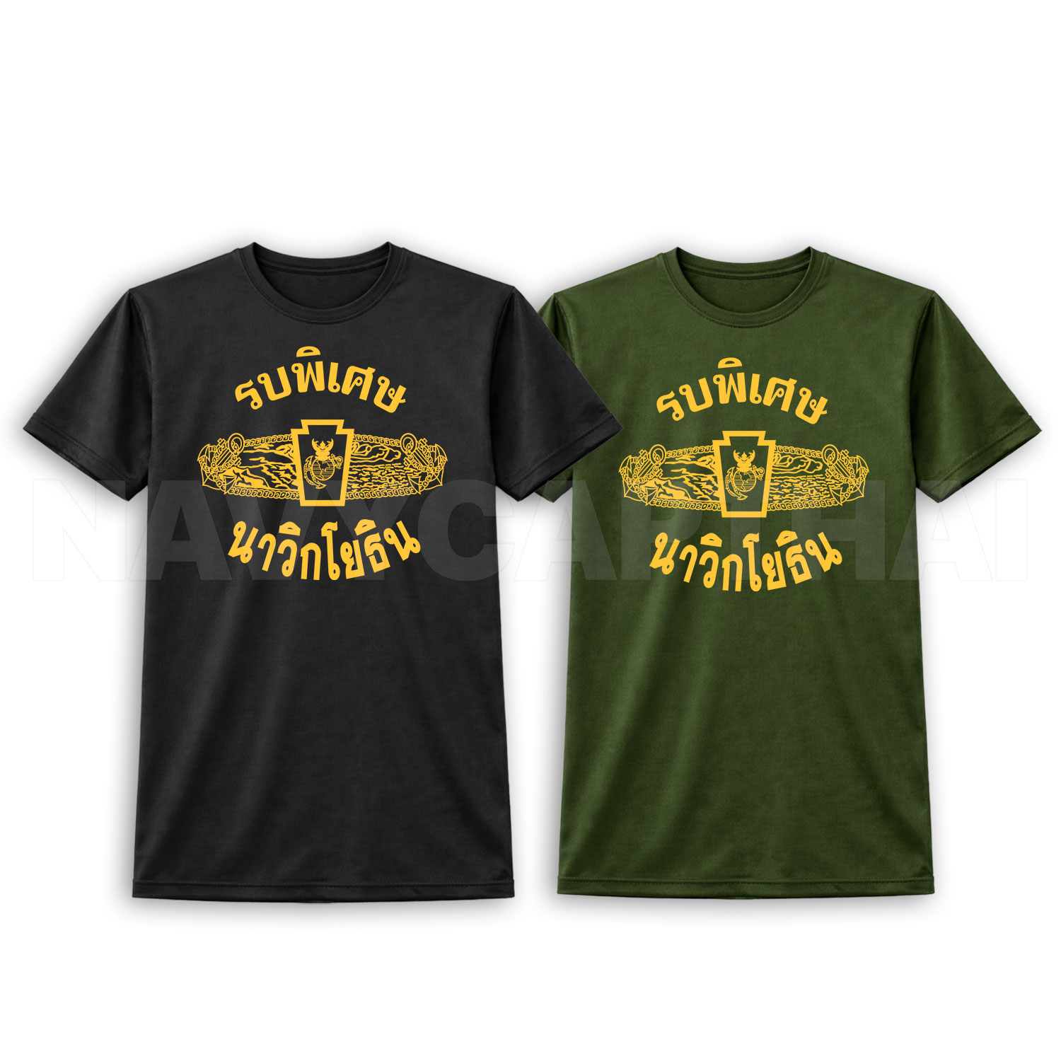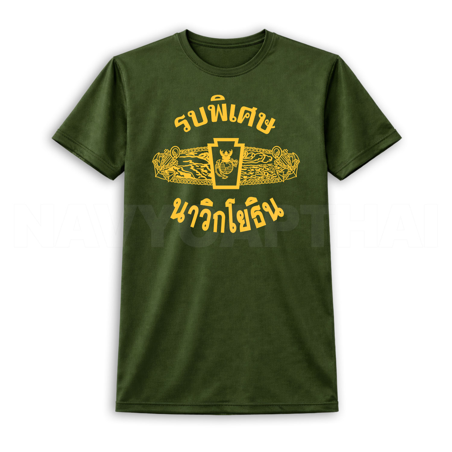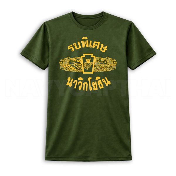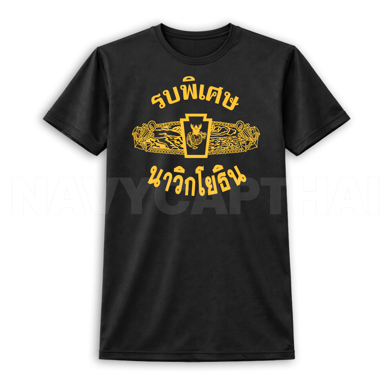 เสื้อยืดลาย “รบพิเศษ นาวิกโยธิน” ดีไซน์สัญลักษณ์โดดเด่น โทนทองตัดพื้นสีเข้ม ให้ลุคดุดัน แข็งแกร่ง สไตล์ทหารภาคสนาม