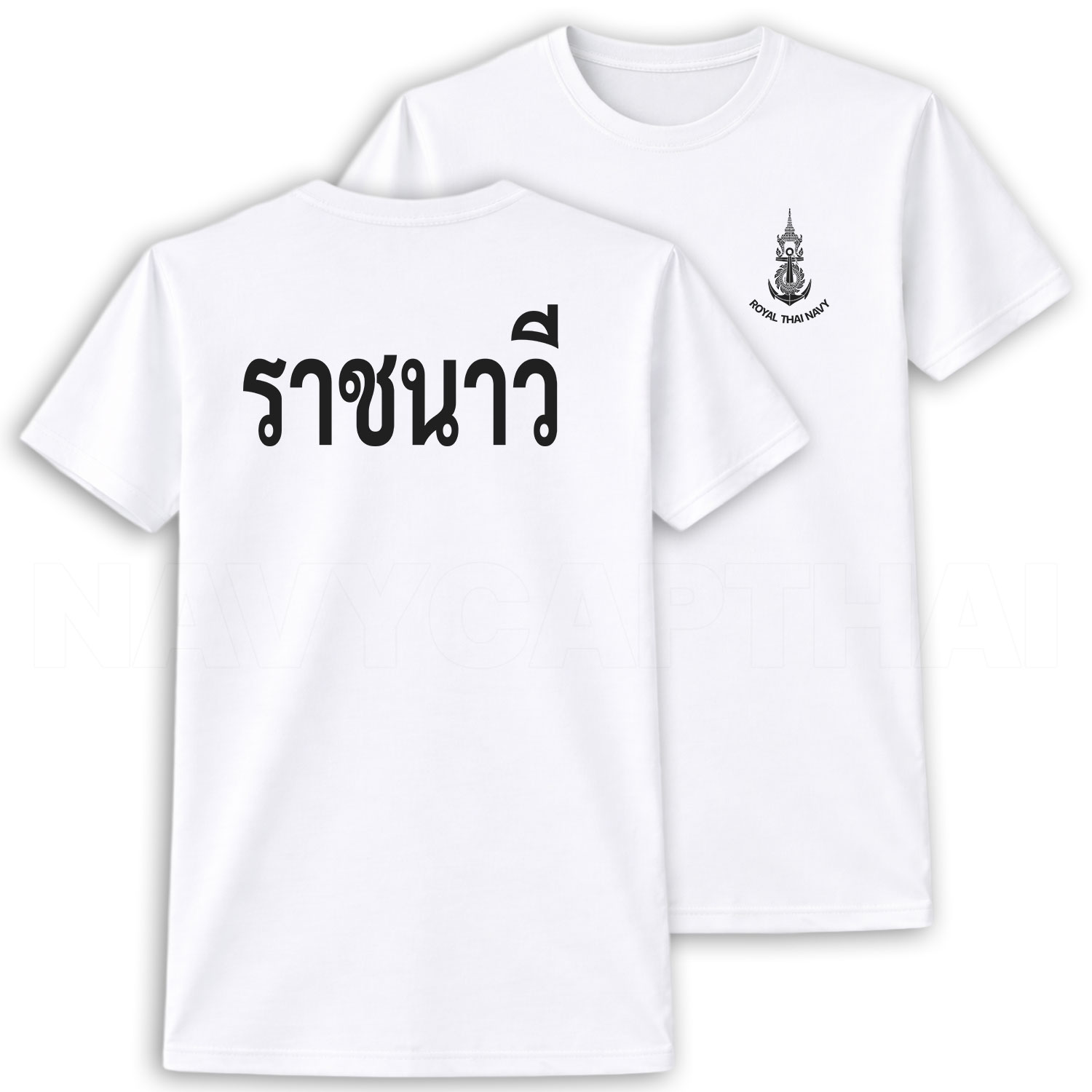 ด้านหน้ามี โลโก้กองทัพเรือ ด้านหลังสกรีนข้อความ “ราชนาวี”