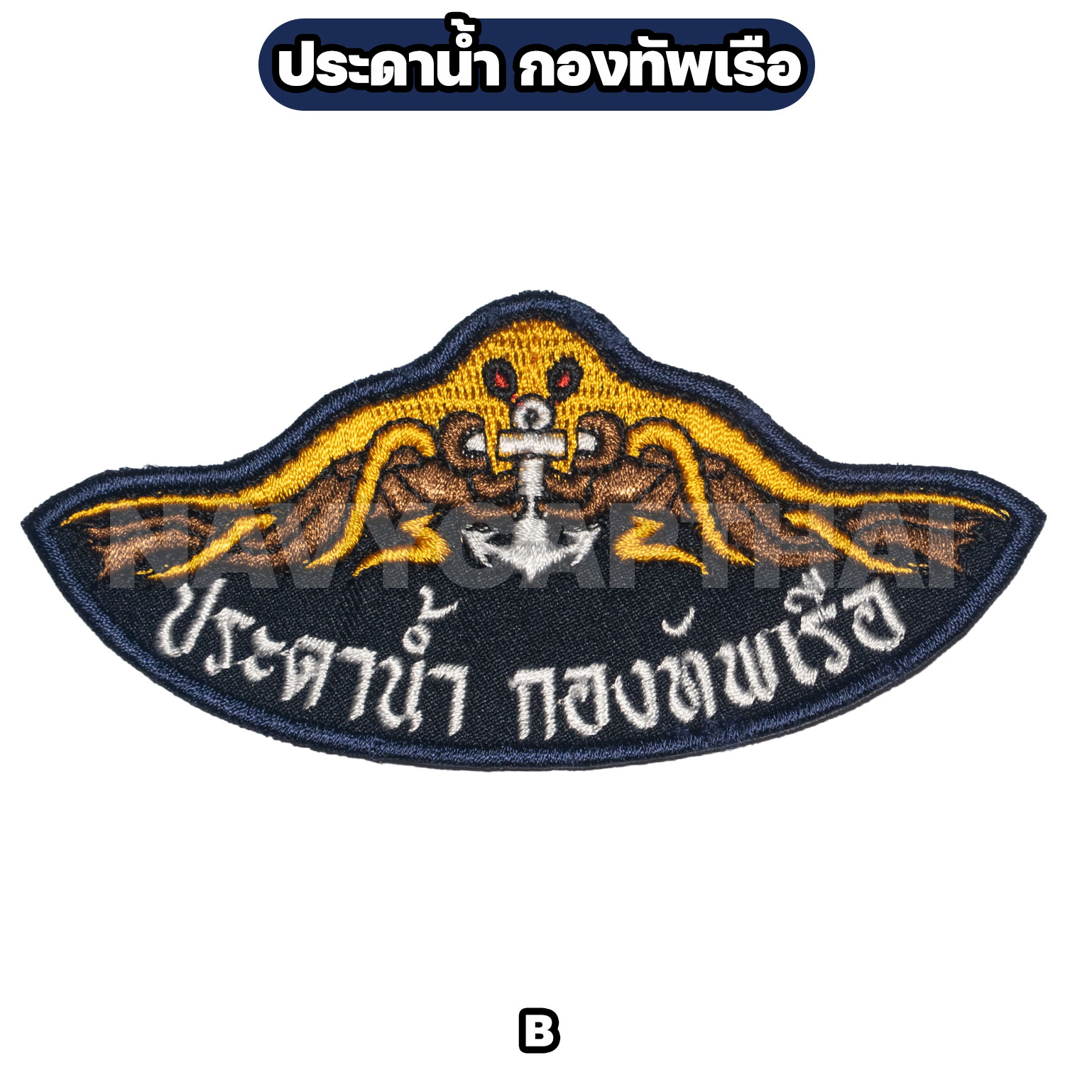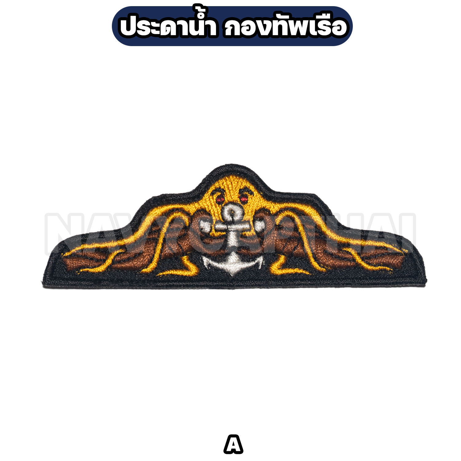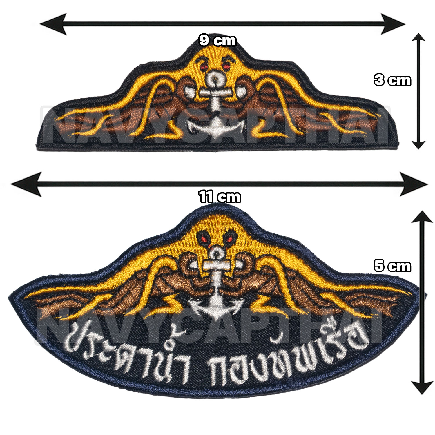 - ขนาดใหญ่ ประมาณ 11 x 5 ซม. (พื้นสีน้ำเงิน พร้อมตัวอักษร “ประดาน้ำ กองทัพเรือ”)