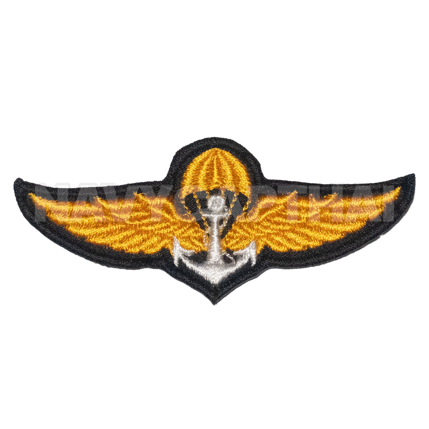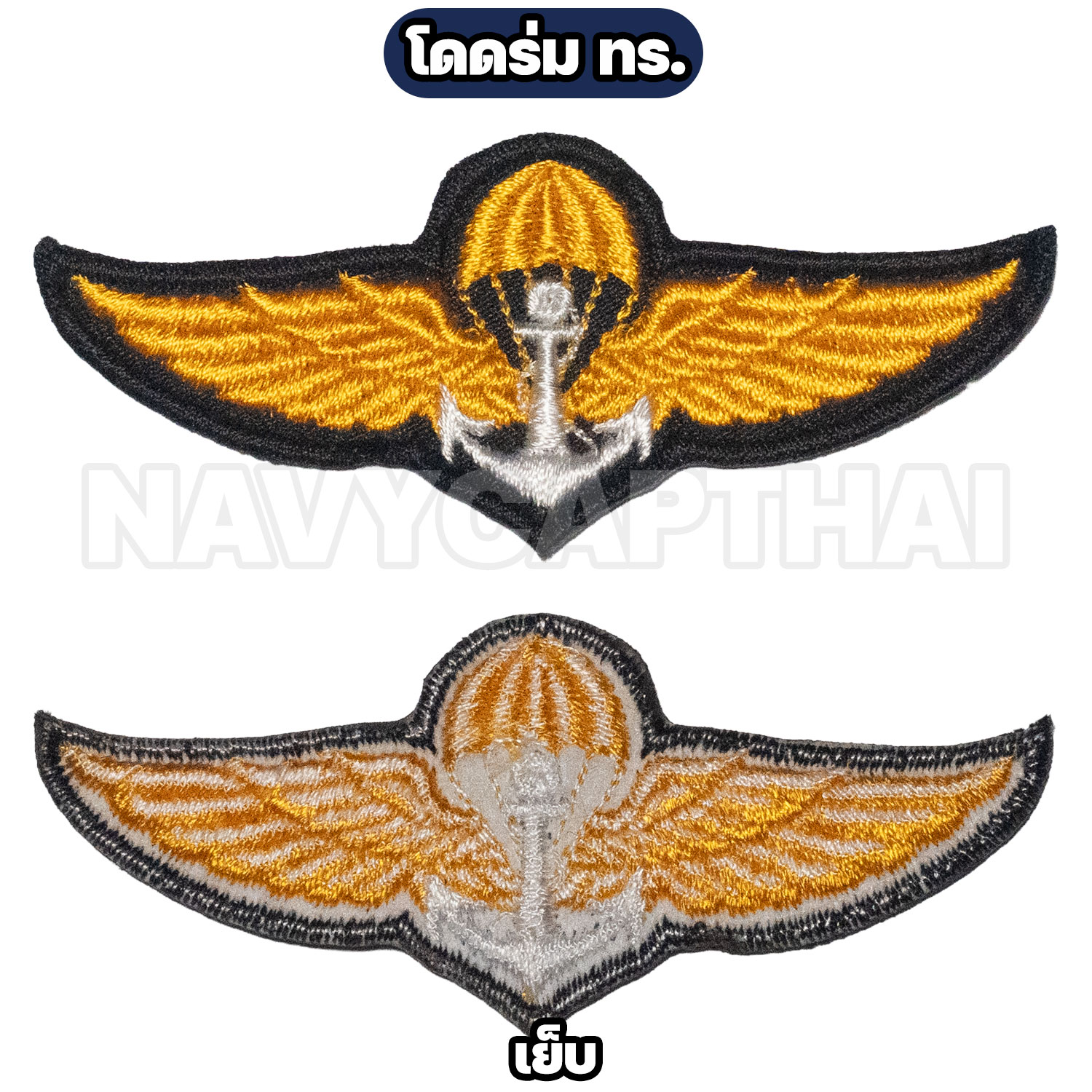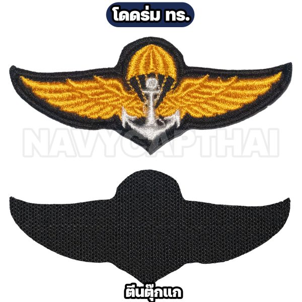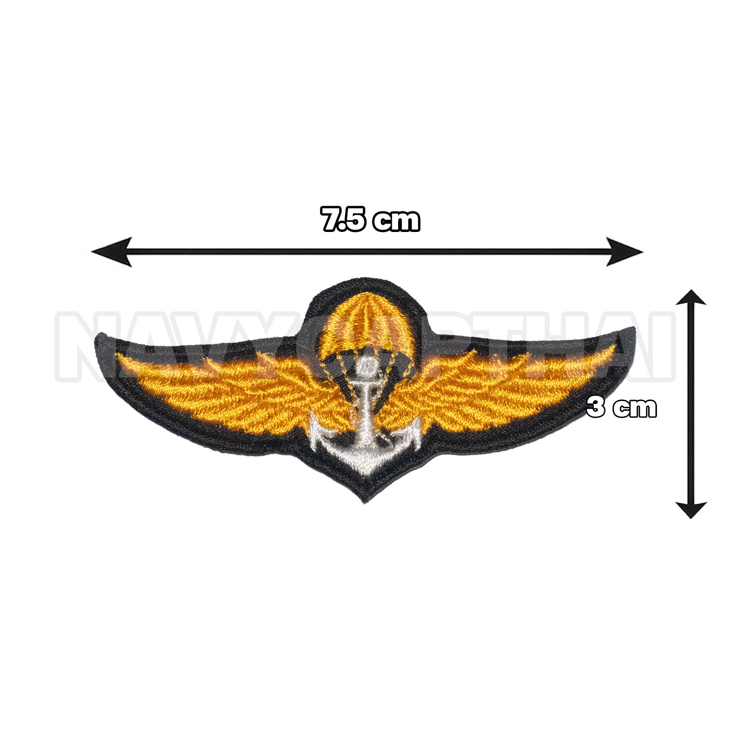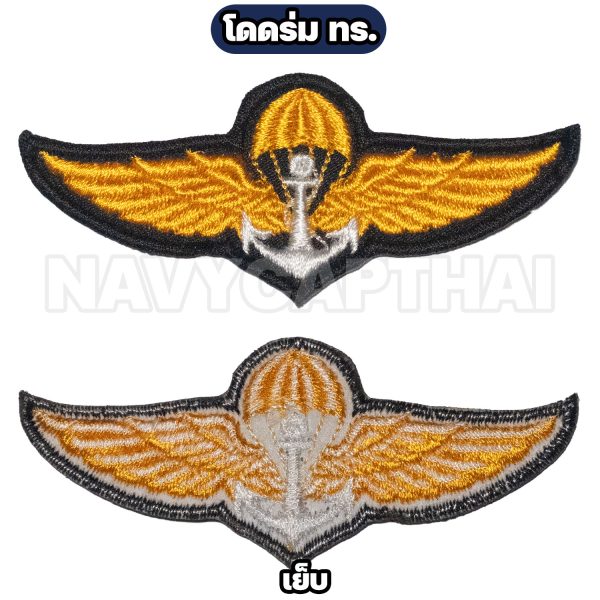 เครื่องหมาย ปีกโดดร่ม กองทัพเรือ (ทร.) งานปักไหมละเอียด สีทองสวยงาม สื่อถึงกำลังพลที่ผ่านการฝึกกระโดดร่มของกองทัพเรือ