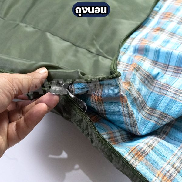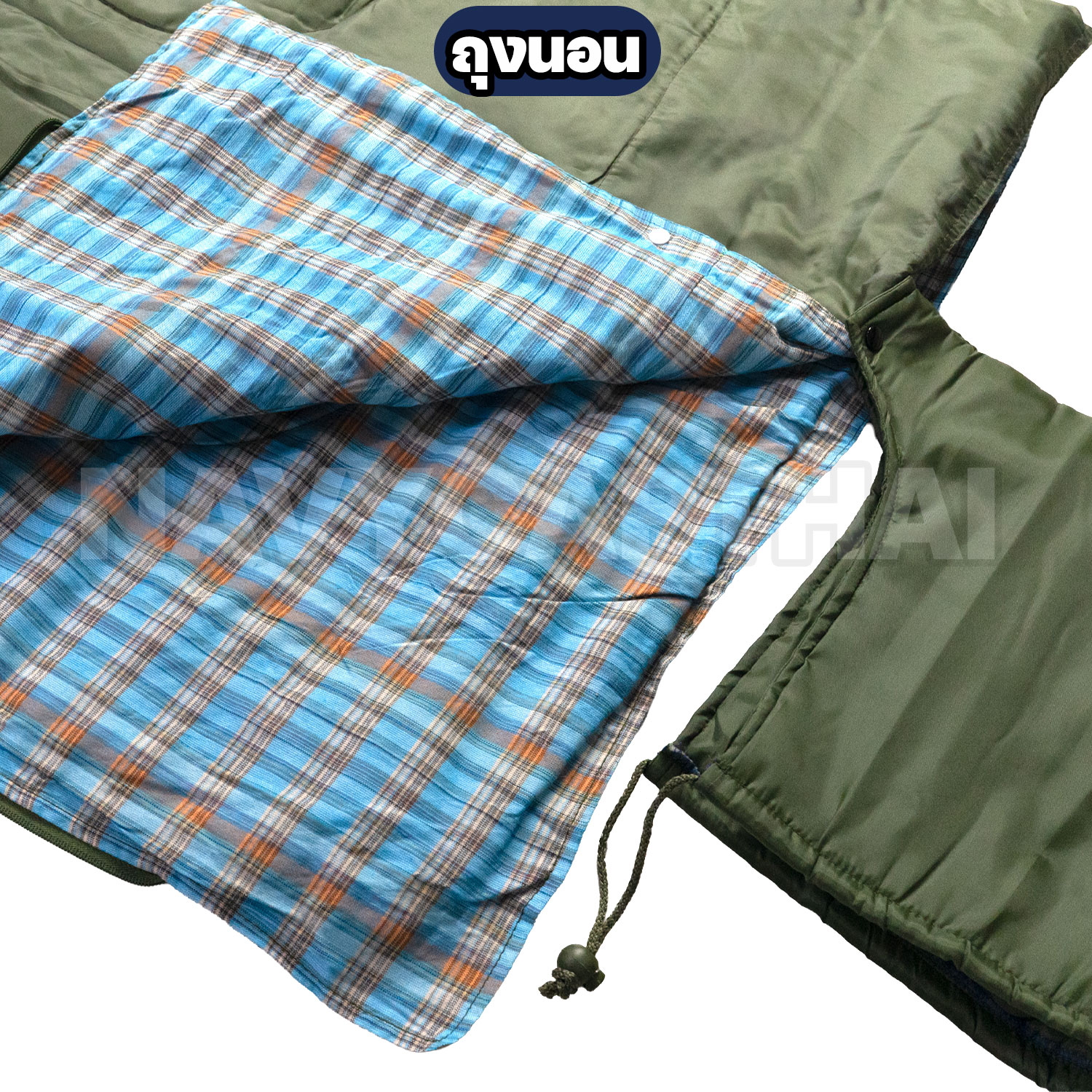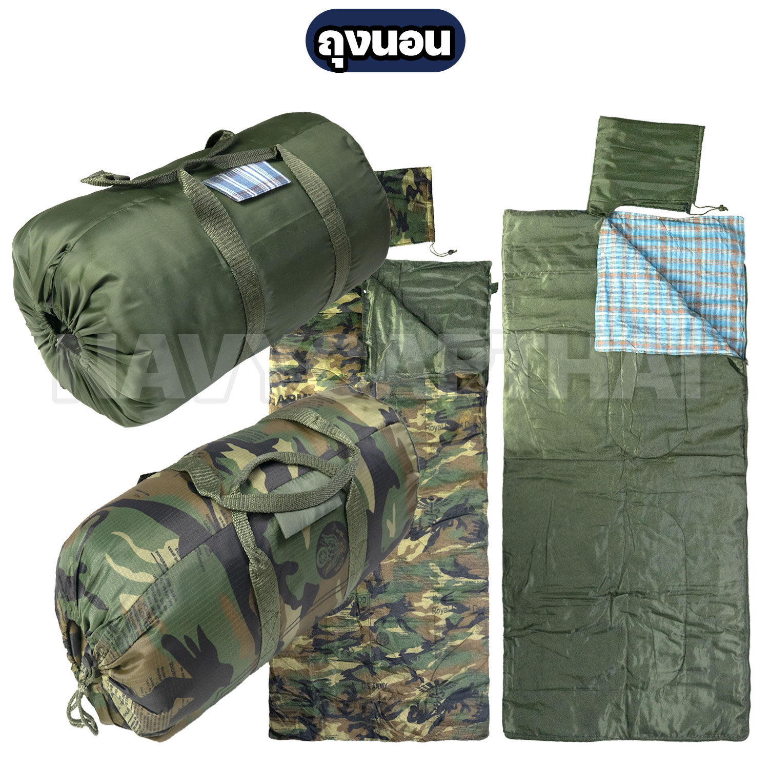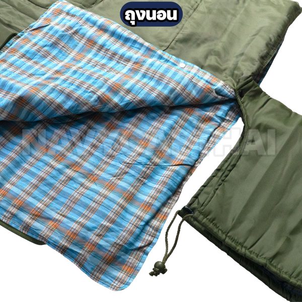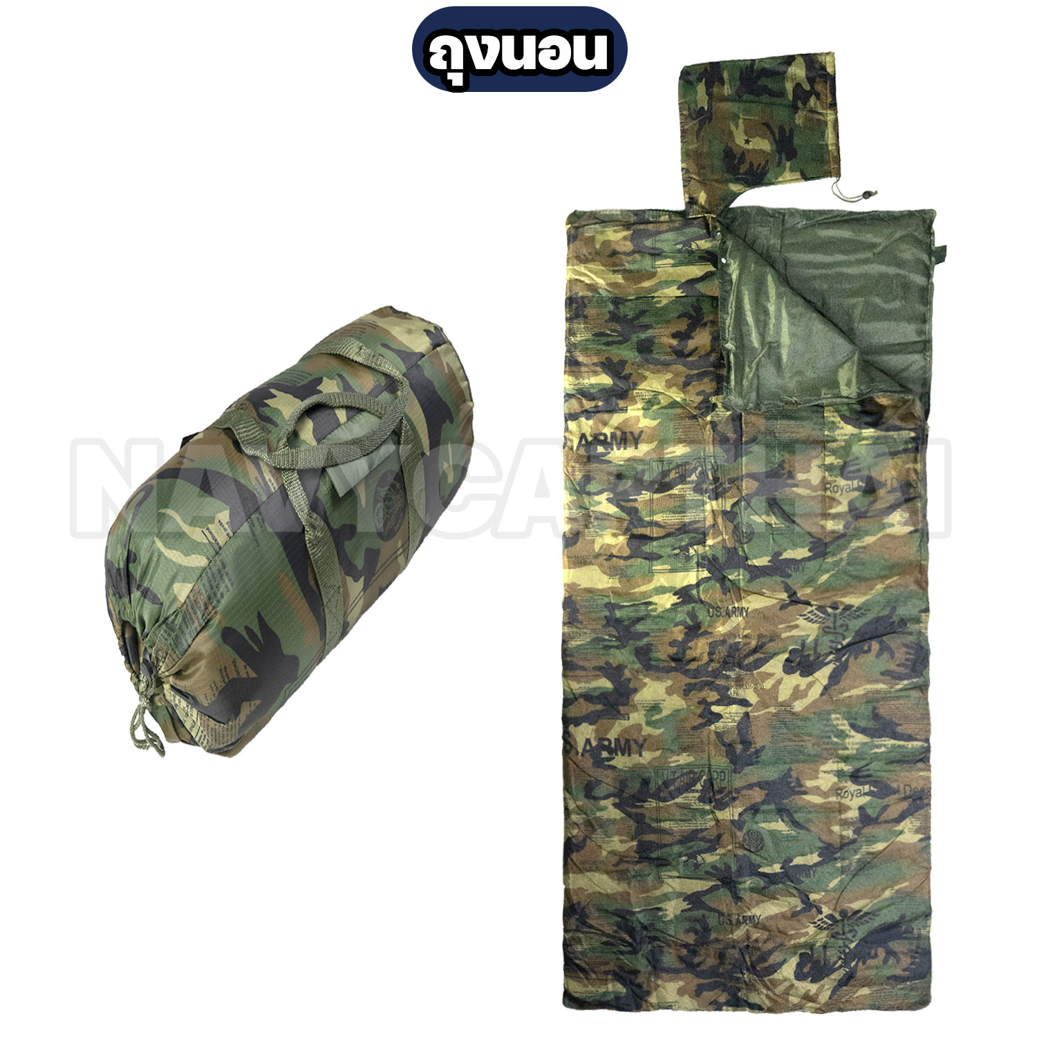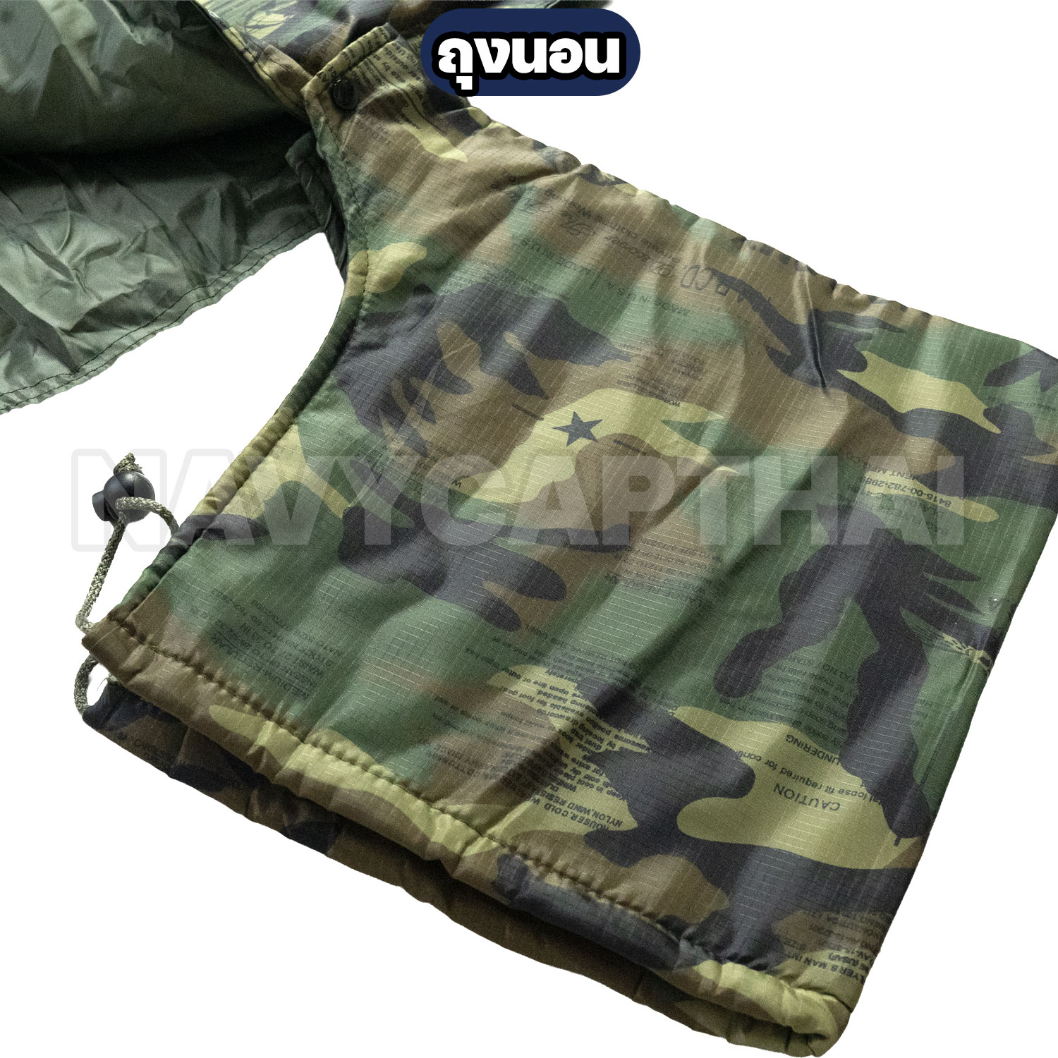 ด้านนอกถุงนอนลายพรางเป็นผ้าร่มริปสต็อป ทนต่อการฉีกขาด พิมพ์ลายอย่างดีไม่ซีดจางเร็ว ซับในเป็นผ้าร่มสีเขียว