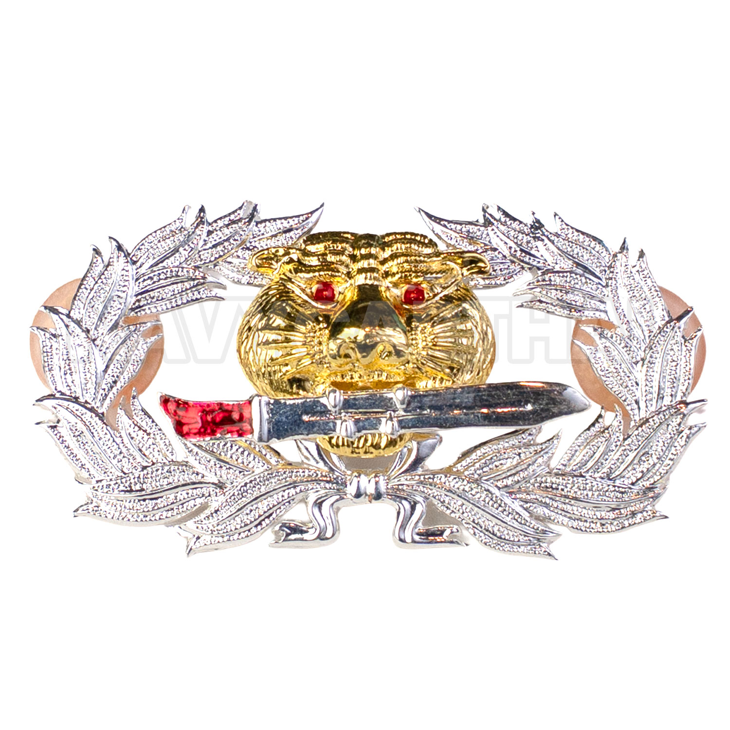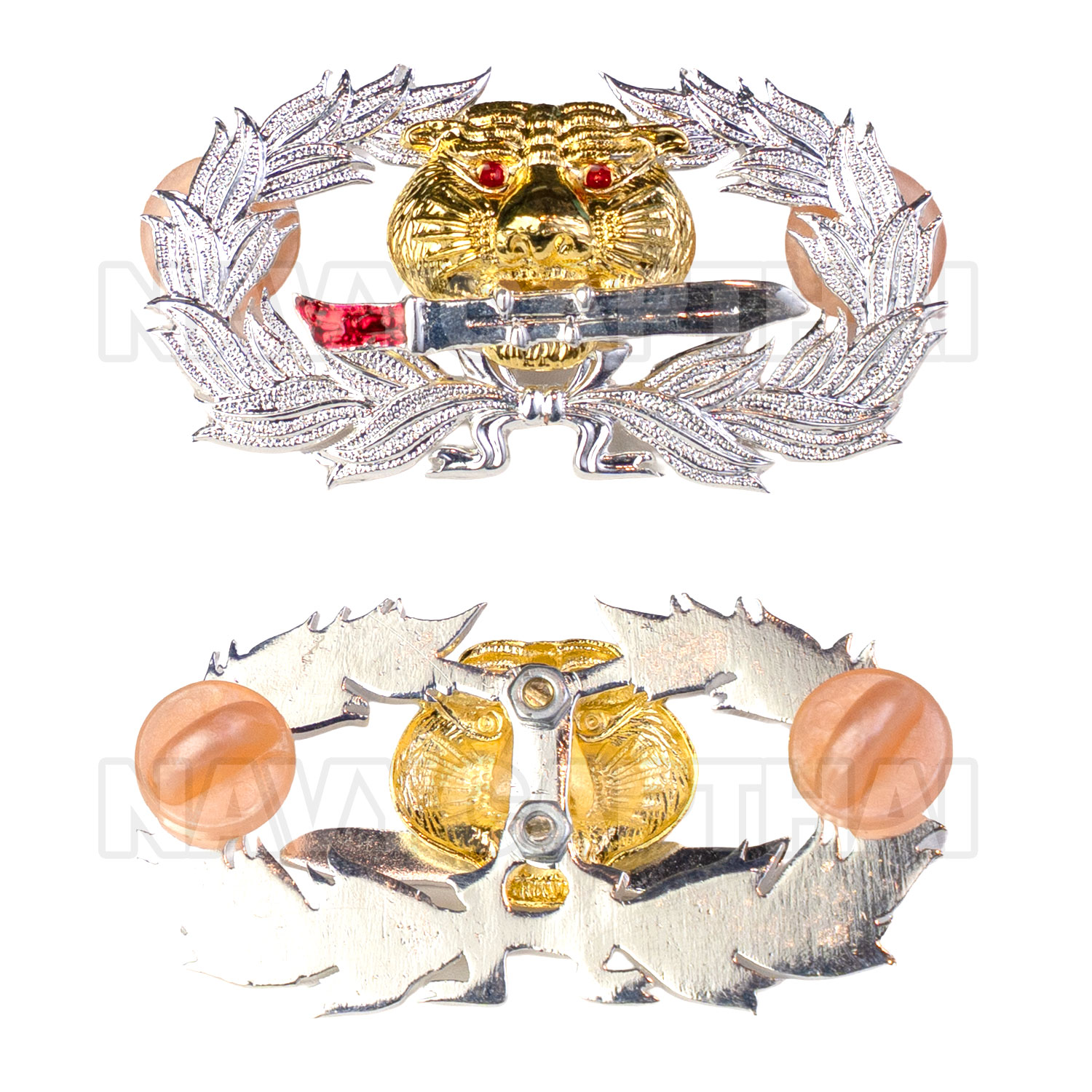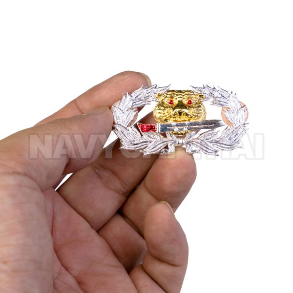 เครื่องหมาย “เสือคาบดาบ” ดีไซน์ดุดัน สื่อถึงความกล้าหาญ ความแข็งแกร่ง และจิตวิญญาณนักรบ เหมาะสำหรับติดเครื่องแบบ ติดอกเสื้อ หรือสะสม